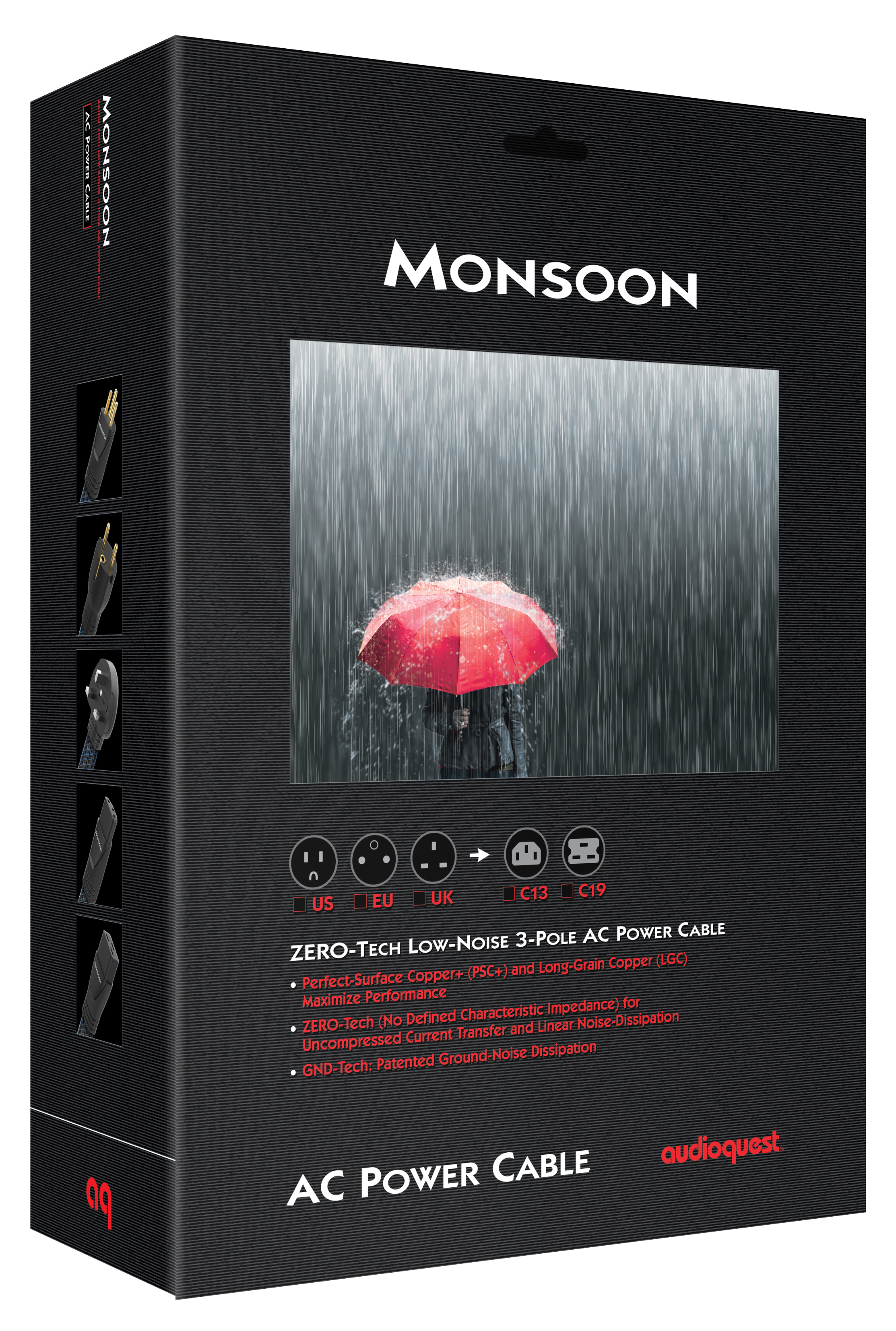 Το AudioQuest Monsoon είναι ένα καλώδιο τροφοδοσίας υψηλών επιδόσεων, σχεδιασμένο για να καλύψει τις ανάγκες απαιτητικών συσκευών ήχου και εικόνας, ενσωματώνοντας μερικές από τις πιο εξελιγμένες τεχνολογίες της AudioQuest: