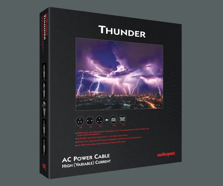 Το AudioQuest Thunder είναι το αποτέλεσμα σχολαστικής μηχανικής και της χρήσης προηγμένων υλικών και τεχνολογιών, σχεδιασμένο για να παρέχει ασυμπίεστη ισχύ σε συσκευές υψηλής κατανάλωσης ρεύματος όπως ενισχυτές, power conditioners και ενεργά ηχεία.