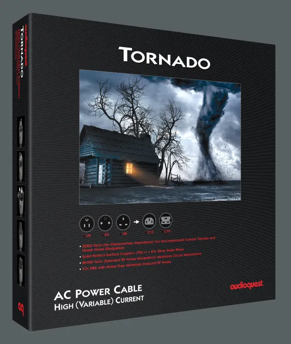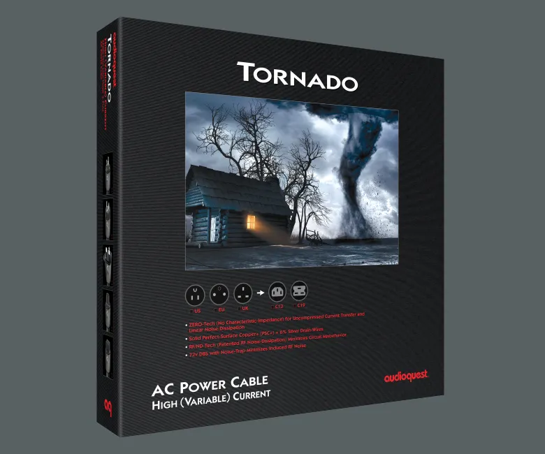 Το AudioQuest Tornado High-Variable Current τοποθετείται στην κορυφή της high-end προς "statement" κατηγορίας καλωδίων τροφοδοσίας, ιδανικό για τις πιο απαιτητικές συσκευές ήχου που απαιτούν τεράστια και απόλυτα καθαρή παροχή ρεύματος.