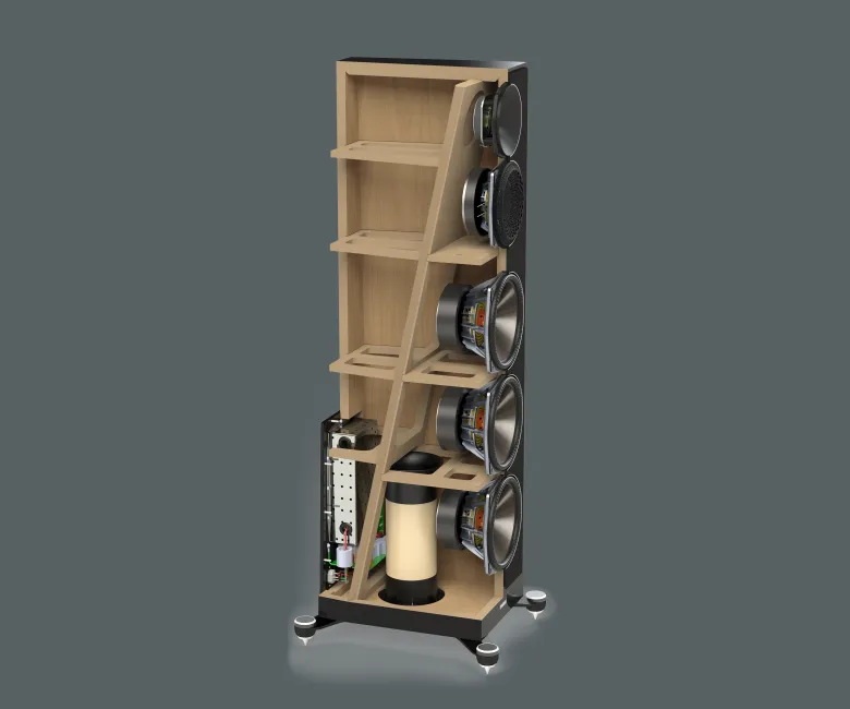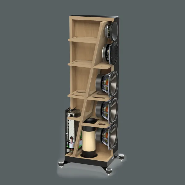 • Σχεδιασμός Περιβλήματος: Το περίβλημα, από υψηλής πυκνότητας υλικά, έχει καμπύλο, μη παραλληλόγραμμο σχήμα για μείωση standing waves. Διαστάσεις 118,8 x 33 x 41,2 cm, βάρος 41,7 kg. Περιλαμβάνει μαγνητική γρίλια και διπλούς ακροδέκτες για bi-wiring/bi-amping, καθώς και είσοδο XLR/RCA για τους ενισχυμένους woofer.
