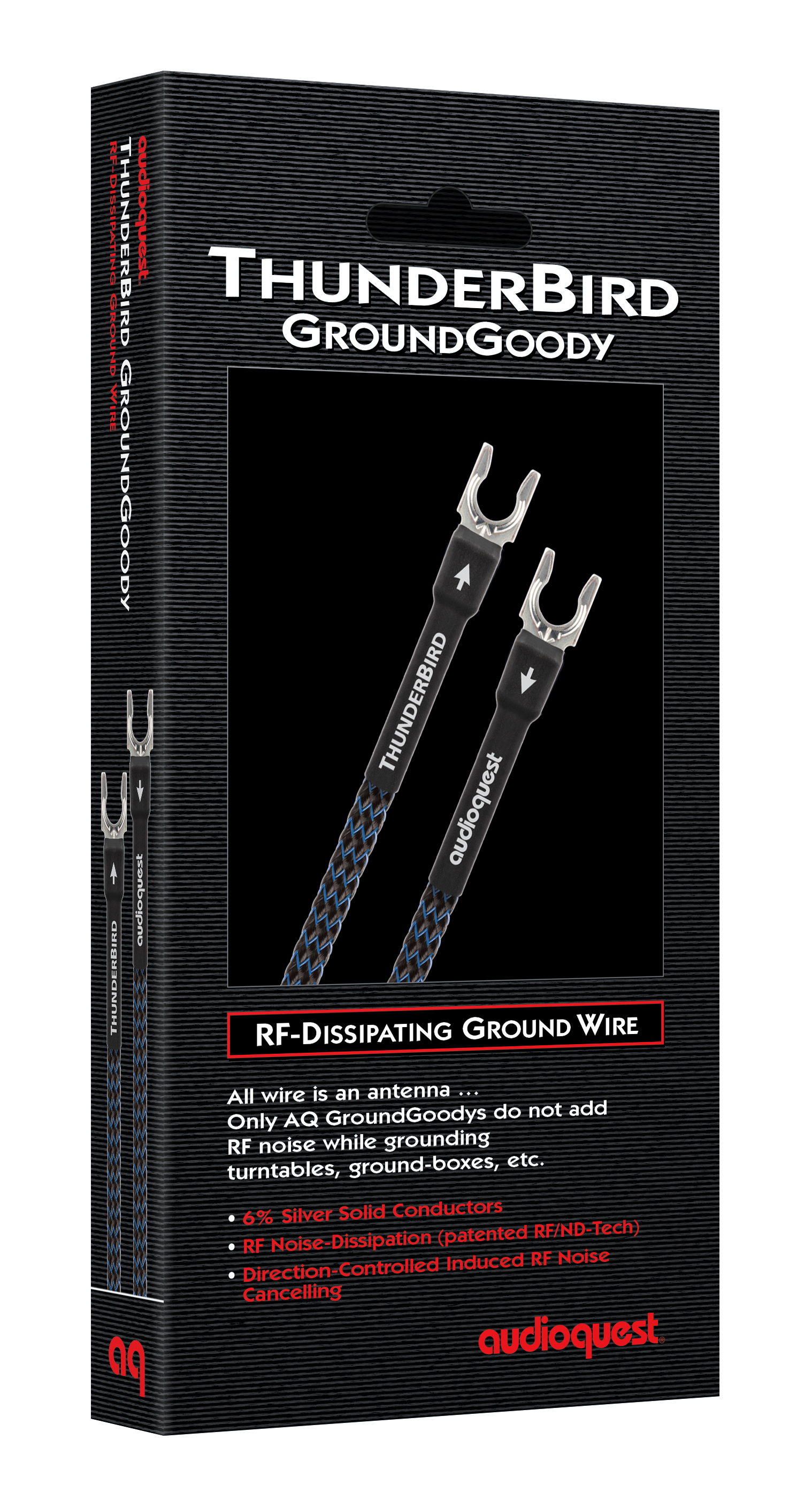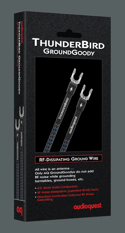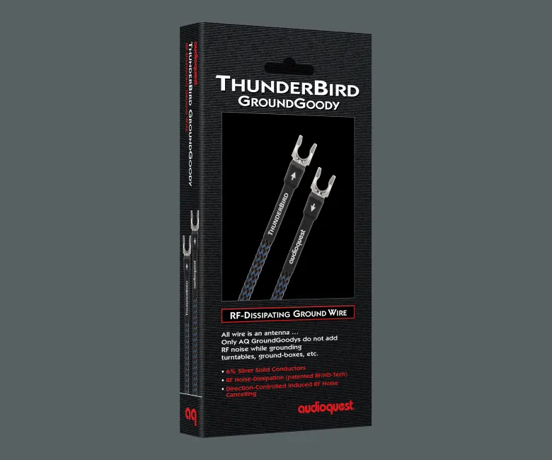 Το AudioQuest Thunderbird GroundGoody είναι ένα καλώδιο γείωσης υψηλών επιδόσεων, σχεδιασμένο για να συνδέεται σε ειδικές υποδοχές γείωσης (Ground) που διαθέτουν ορισμένα high-end εξαρτήματα ή σε αχρησιμοποίητες εισόδους/εξόδους, με σκοπό την δραστική μείωση του θορύβου γείωσης και των παρεμβολών RFI/EMI.